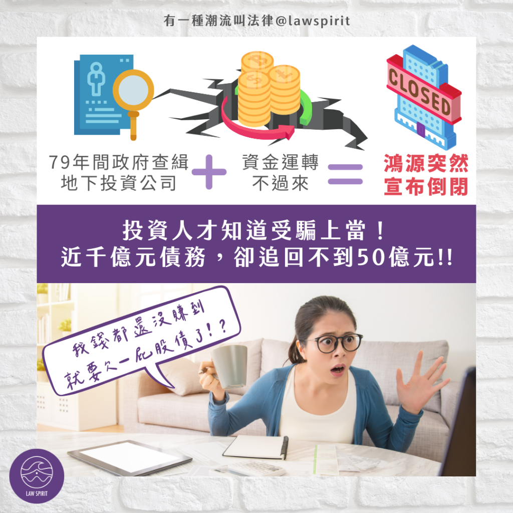結果因為79年間政府查緝地下投資公司,加上資金運轉不過來,鴻源突然宣布倒閉,投資人才知道受騙上當,近千億元債務,卻追回不到五十億元 [1],許多人因此負債累累。