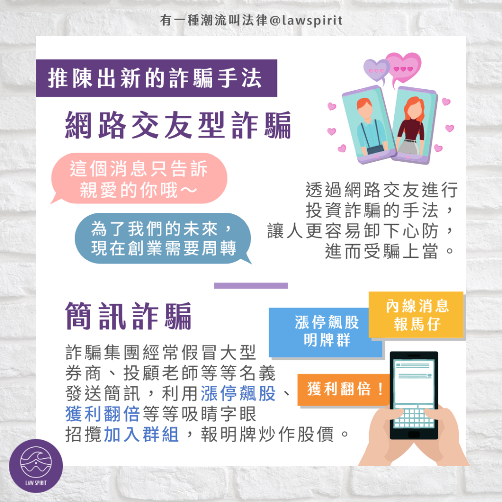 然而隨著時代的演進,詐騙集團的手法也是推陳出新,可能假借例如「虛擬貨幣」、「NFT」等等一些新科技技術,利用資訊尚未大量流通或是所涉及的領域專業而進行詐騙,近年來常見的投資詐騙手法有: