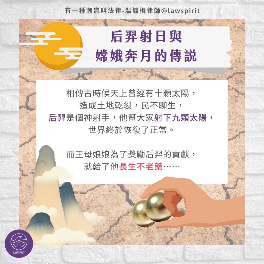 其中一個傳說就是嫦娥奔月,相傳是古時候天上曾經有十顆太陽,造成土地乾裂,民不聊生,后羿是個神射手,他幫大家射下九顆太陽,世界終於恢復了正常。而王母娘娘為了獎勵后羿的貢獻,就給了他長生不老藥。