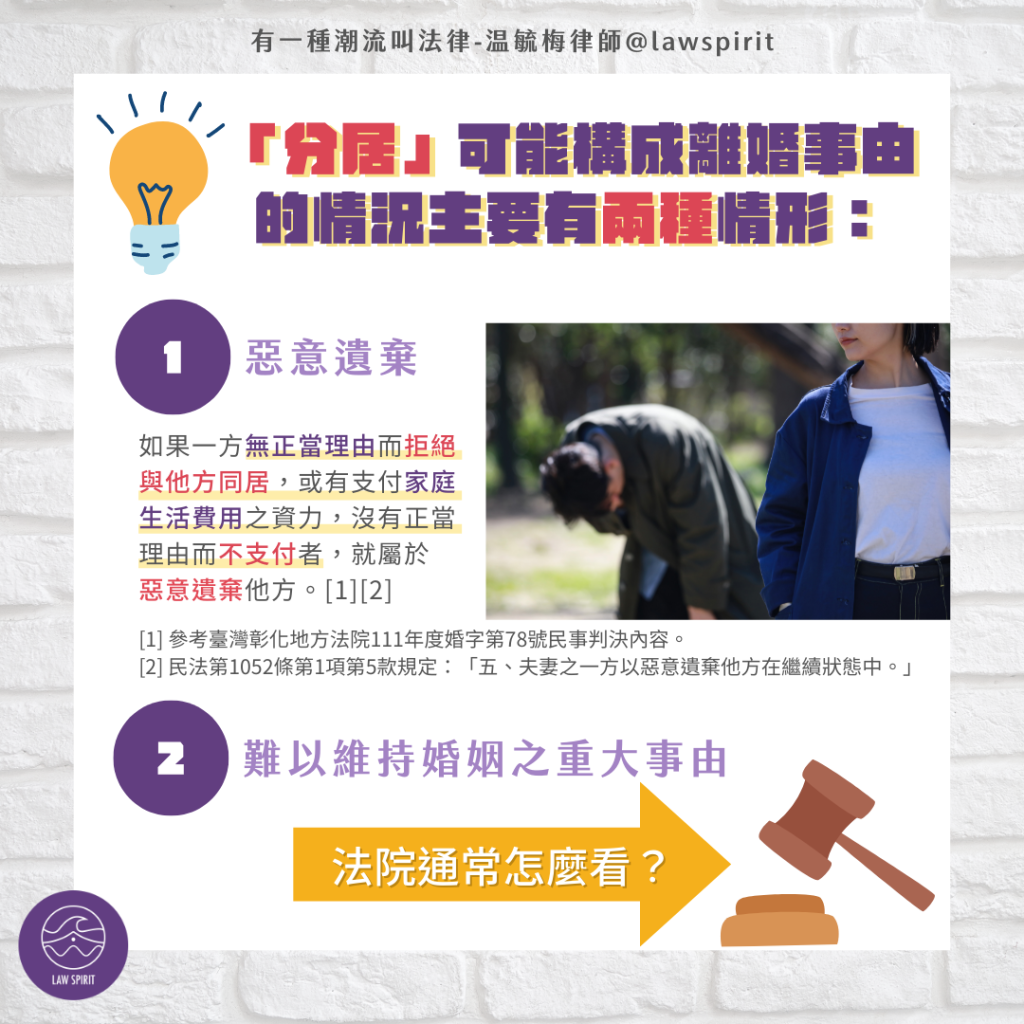 一般來說以「分居」做為離婚的事由,還是要再舉出更多無法維持婚姻的理由,才能說服法官,這個婚姻已經沒辦法再維持下去了。