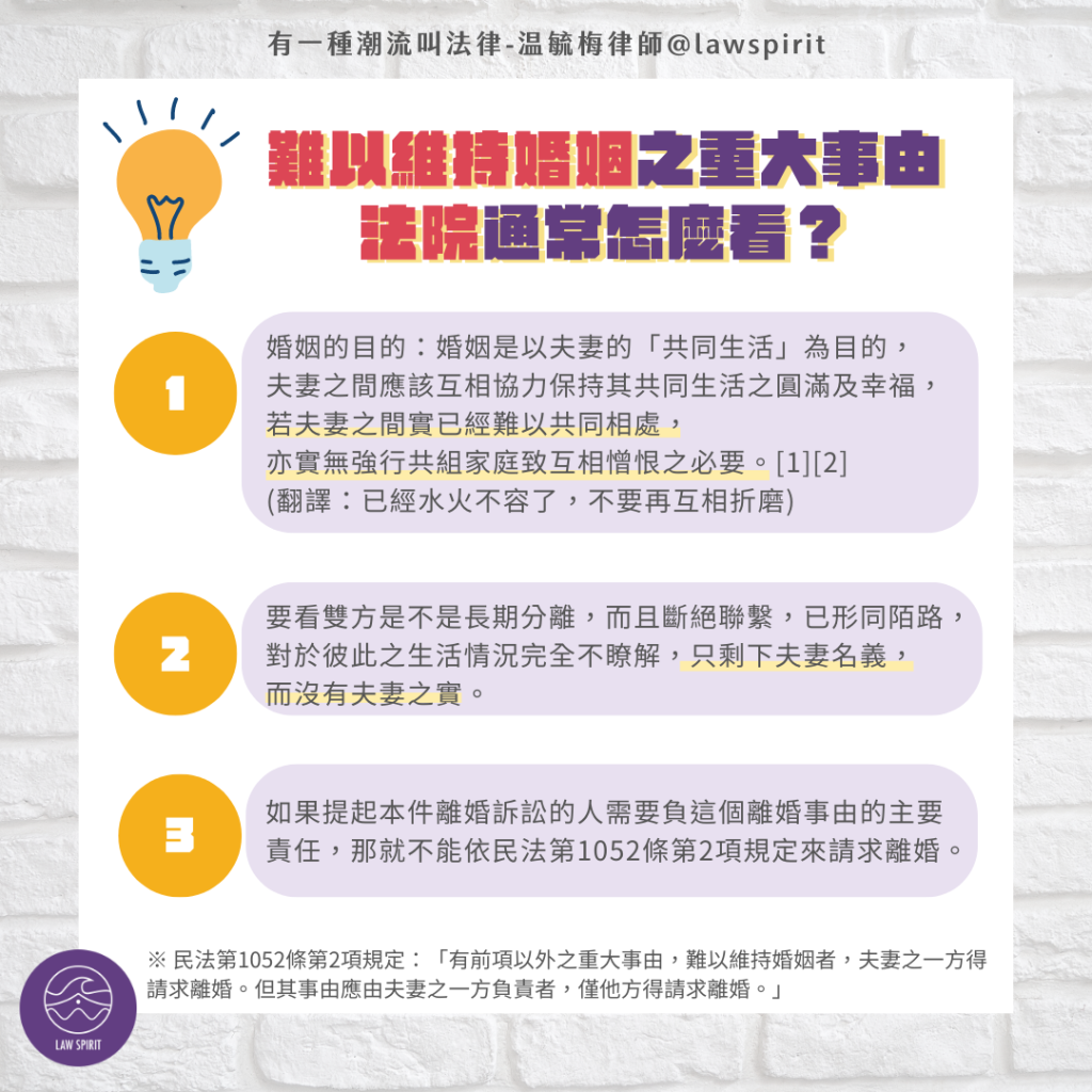 •婚姻的目的:婚姻是以夫妻的「共同生活」為目的,夫妻之間應該互相協力保持其共同生活之圓滿及幸福,若夫妻之間實已經難以共同相處,亦實無強行共組家庭致互相憎恨之必要(翻譯:已經水火不容了,不要再互相折磨)。