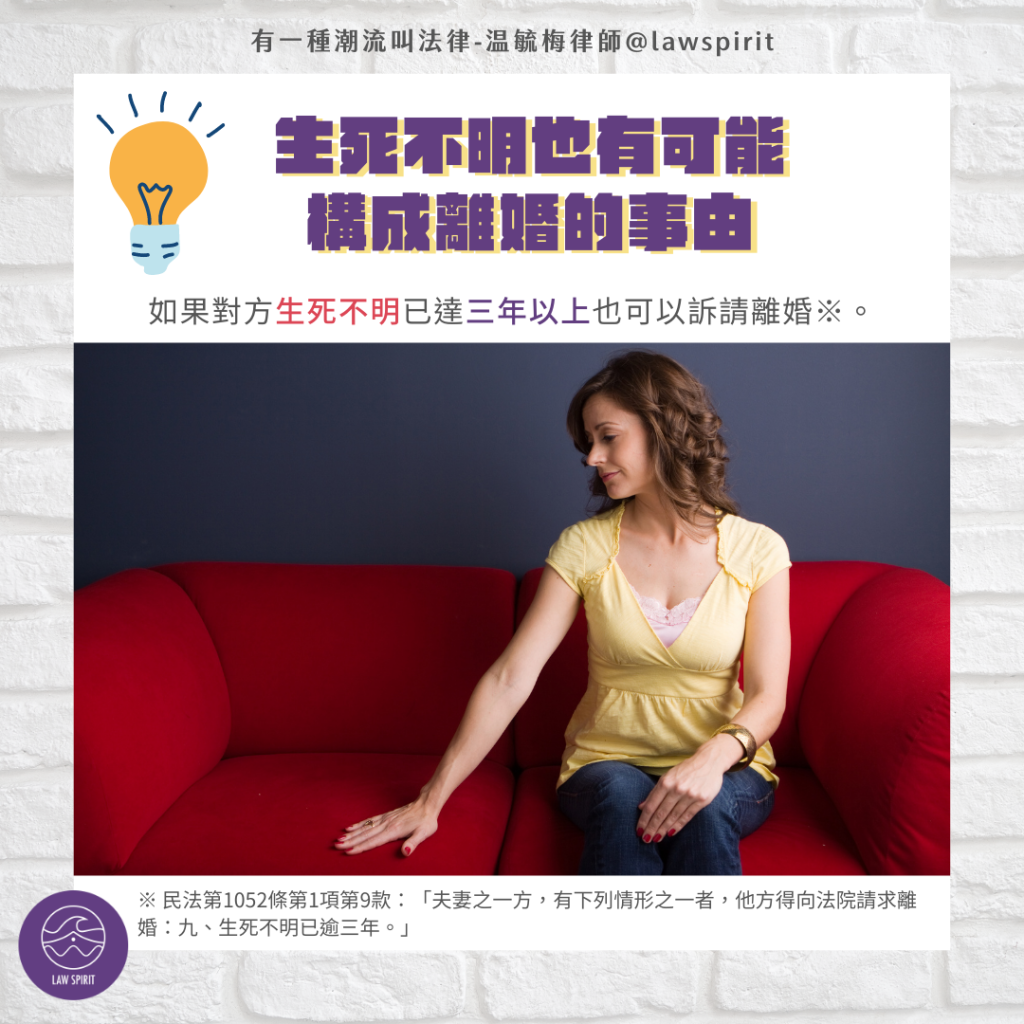 [4] 民法第1052條第1項第9款:「夫妻之一方,有下列情形之一者,他方得向法院請求離婚:九、生死不明已逾三年。」