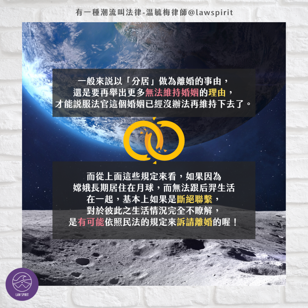 而最後嫦娥和后羿一個人在月亮、一個在地球,基本上跟后羿沒辦法聯絡生活也沒有交集,這種長時間分居的結果到底有沒有構成離婚的事由?